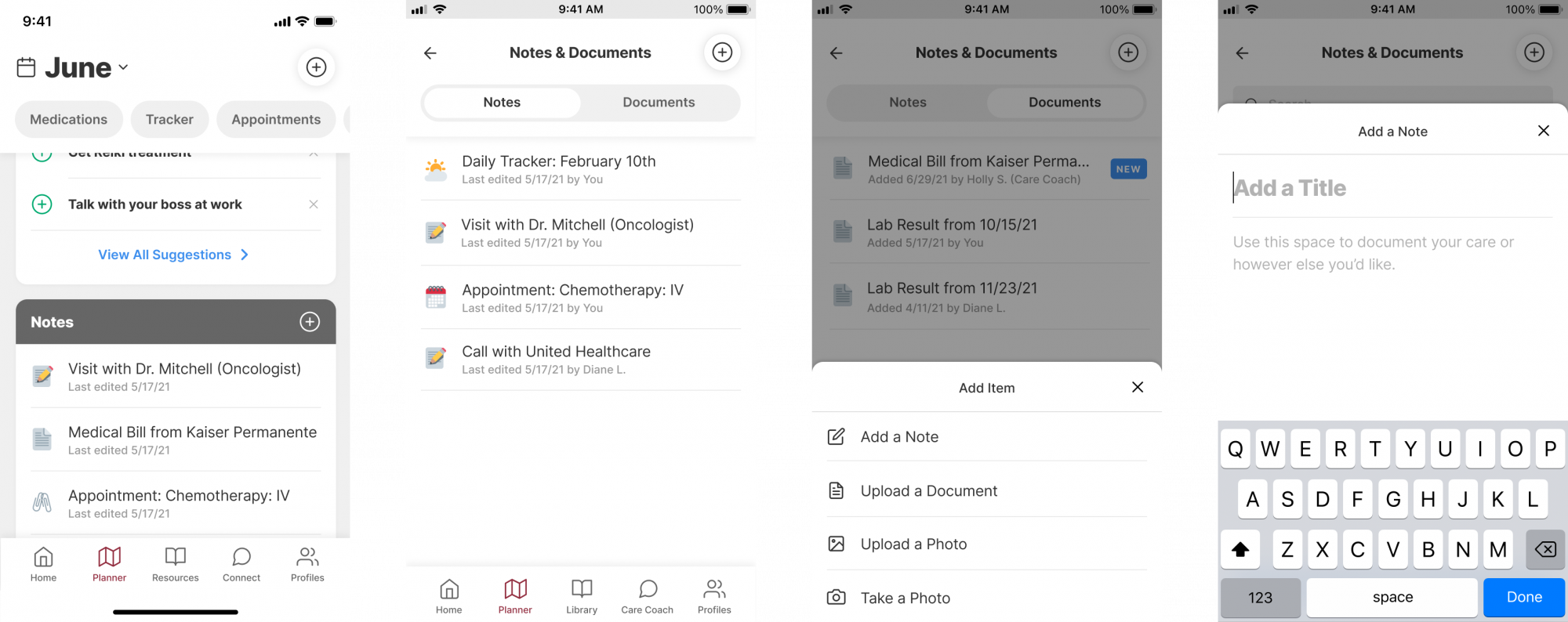 Led design on core features such as notes, messages, symptom tracker and a personalized content library. Each feature was designed to help cancer patients stay organized, track their well-being, and access actionable content matched to their condition.